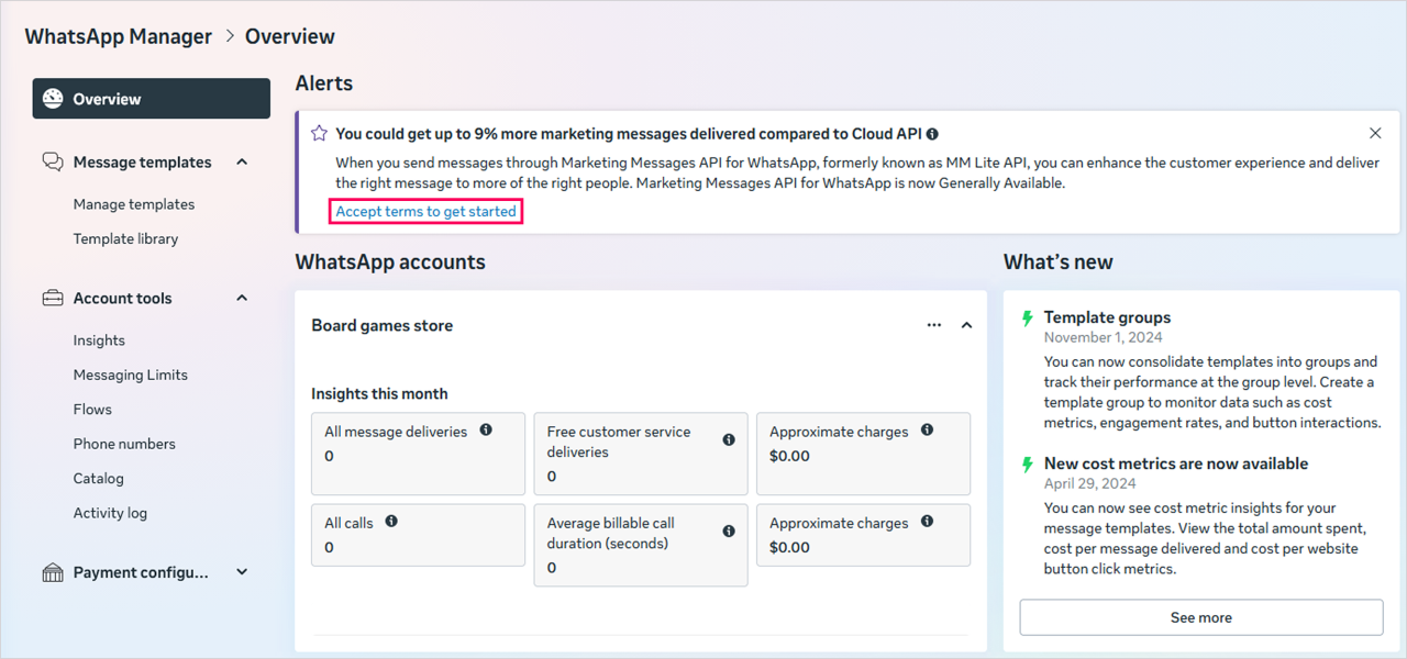 infoIf the notification you need isn't in the Overview section, go to Message Templates → Manage Templates and click Accept terms to get started in the notification area.