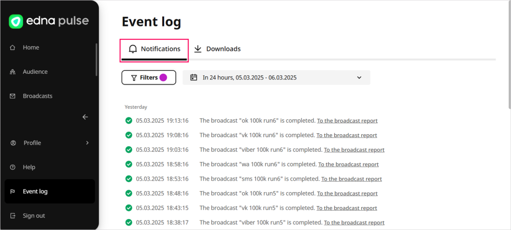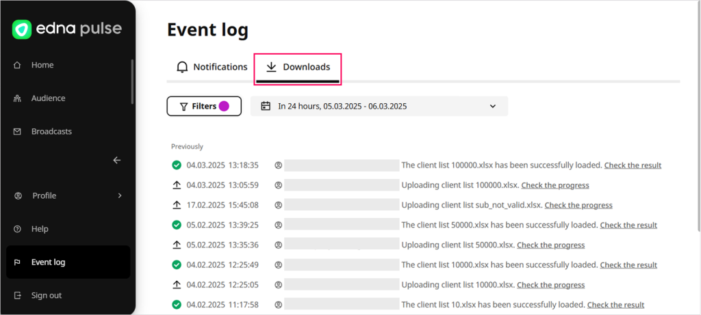 In the Event log section, you can view event notifications in edna Pulse personal account and view download results: